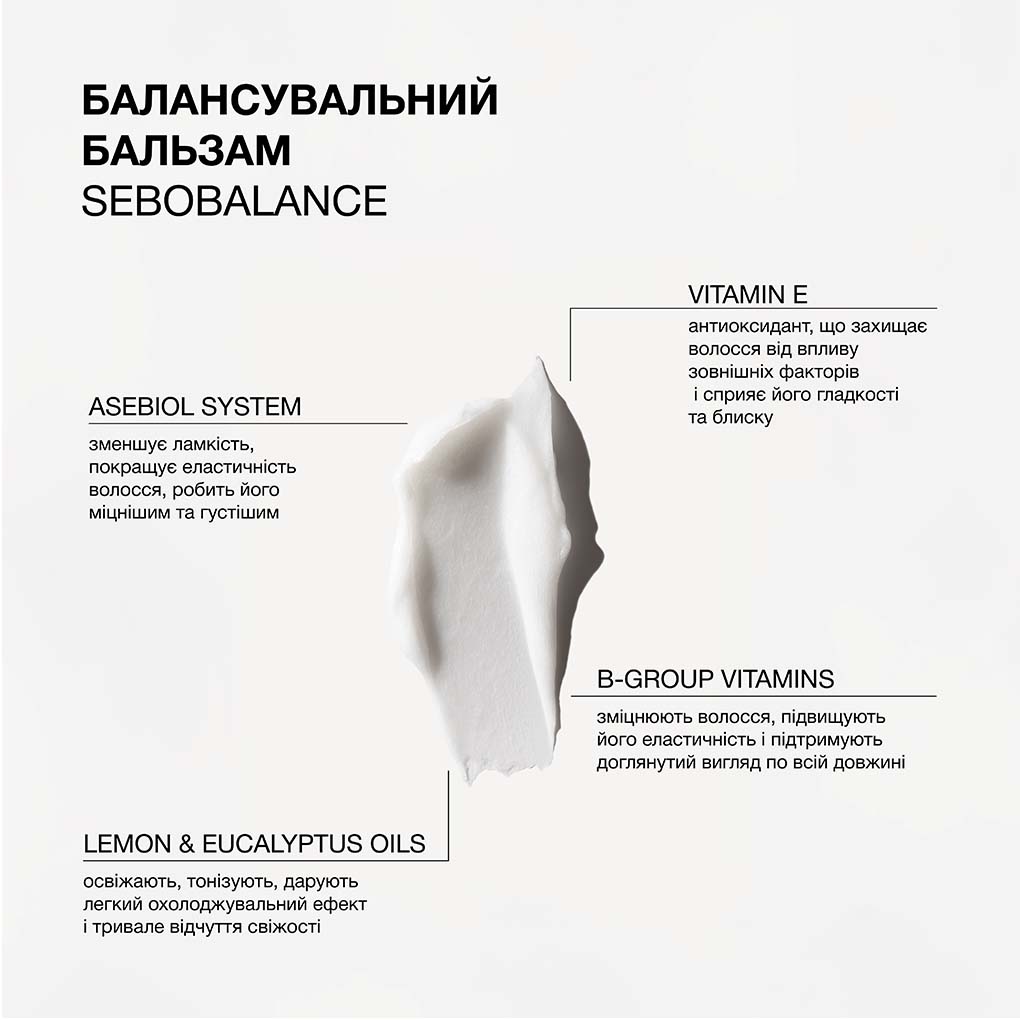 Балансувальний бальзам Sebobalance – це професійний догляд для волосся, схильного до жирності, який доповнює дію шампуню та підтримує природний баланс шкіри голови. Легка формула з Asebiol system, ефірними оліями лимона та евкаліпта доглядає за волоссям без обтяження, надає м’якості й відчуття свіжості.