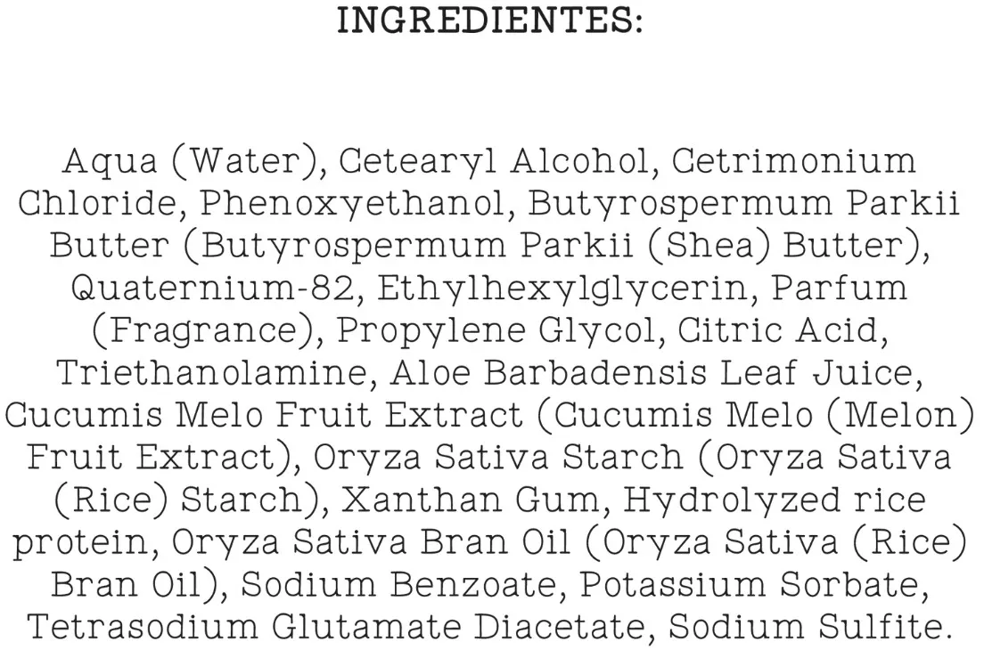 Склад:Aqua (Water), Cetearyl Alcohol, Decyl Glucoside, Hydroxypropyl Starch Phosphate, Quaternium-82, Ceteareth-30, Cetrimonium Chloride, Phenoxyethanol, Citric Acid, Ethylhexylglycerin, Propylene Glycol, Parfum (Fragrance), Triethanolamine, Aloe Barbadensis Leaf Juice, Cucumis Melo Frut Extract (Cucumis Melo (Melon) Fruit Extract), Oryza Sativa Starch (Oryza Sativa (Rice) Starch), Xanthan Gum, Hydrolyzed rice protein, Oryza Sativa Bran Oil (Oryza Sativa (Rice) Bran Oil), Sodium Benzoate, Potassium Sorbate, Sodium Sulfite, Tetrasodium Glutamate Diacetate.