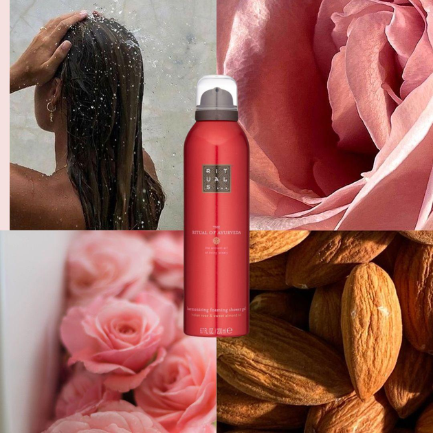 Гель-пінка для ванни Rituals The Ritual of Ayurveda — гармонійне поєднання європейських технологій і секретів індуїстської народної медицини, яке перетворює догляд за тілом на миті райського задоволення. Невагома, немов хмара, консистенція обволікає шкіру м’якістю і комфортом, а цінні рослинні олії надають вітамінізувальний, зволожувальний і заспокійливий вплив. Чарівний аромат індійської троянди пробуджує чуттєвість, а цукрова пудра мигдалю дарує відчуття дитячої життєрадісності.