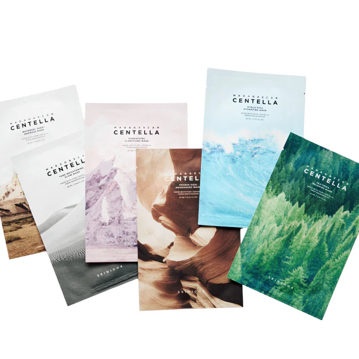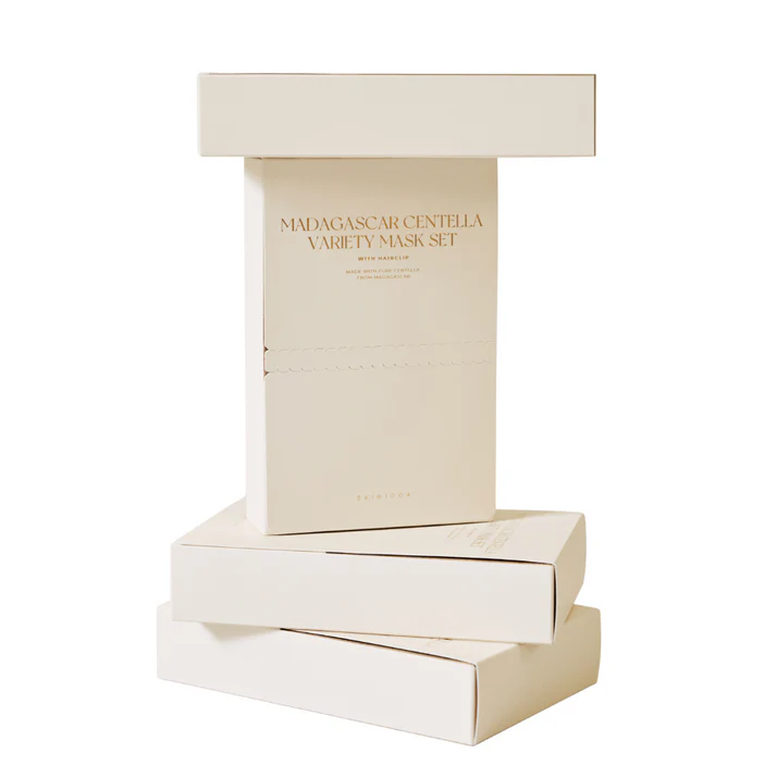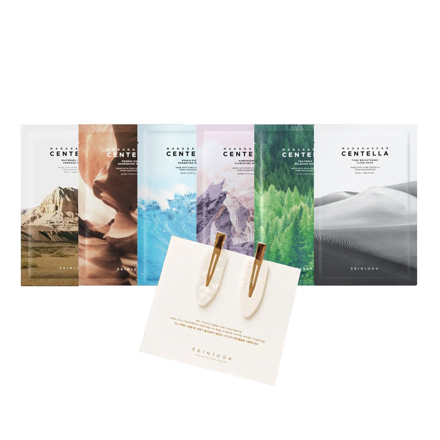 Skin 1004 Madagascar Centella Variety Mask Set – набір із 6 тканинних масок з різних серій бренду Skin 1004. Усі формули продуктів містять заспокійливий та зволожувальний екстракт центелли азіатської. У наборі також є дві заколки з логотипом бренду, щоб прибрати волосся під час нанесення обраної маски. До набору входять маски з таких серій: