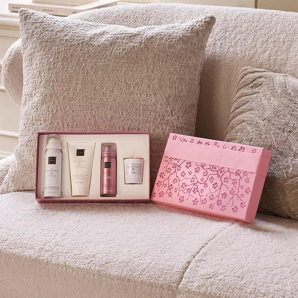 Приголомшливий подарунковий набір містить чотири моменти з колекції «Ритуал сакури», які з ніжним ароматом рисового молока та вишневого цвіту гарантують справжнє благополуччя та дозволяють вам відчувати новий початок кожного дня. Пінка для душу та пілінг для тіла м’яко та ретельно очищають вашу шкіру, крем для тіла потім ніжно живить її, а аромат свічки створює потрібну атмосферу для процедури догляду з «Ритуалом сакури». Скринька ідеально підходить для зберігання інших цінностей, дизайн орігамі натхненний японським мистецтвом дарування.