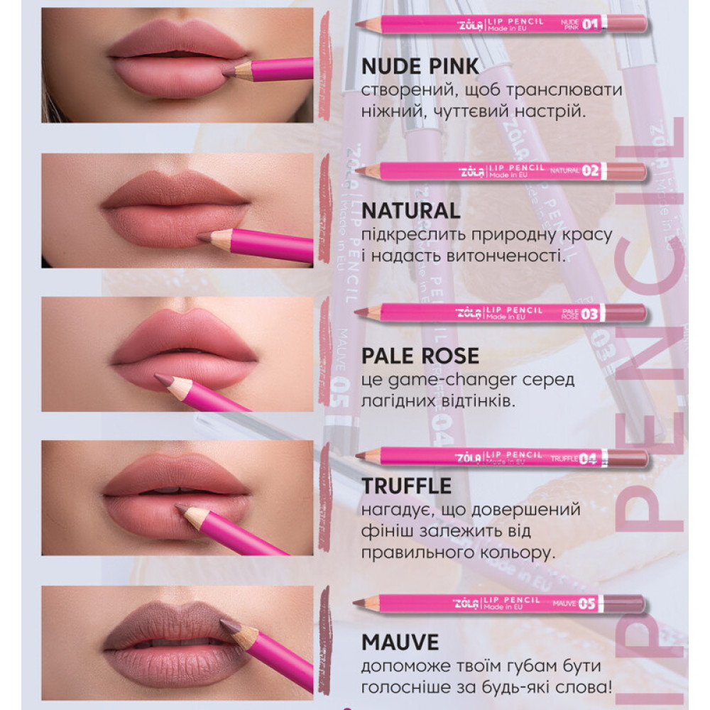 ZOLA Lip Pencil – ідеальні олівці для губ, презентовані відомим українським б’юті-брендом! Професійна розробка, високий рівень якості, суперактуальні кольори – абсолютний максимум для бездоганного макіяжу! Кожна усмішка потребує ефектного обрамлення! Олівці ZOLA Lip Pencil – найкращий спосіб досягти досконалості!