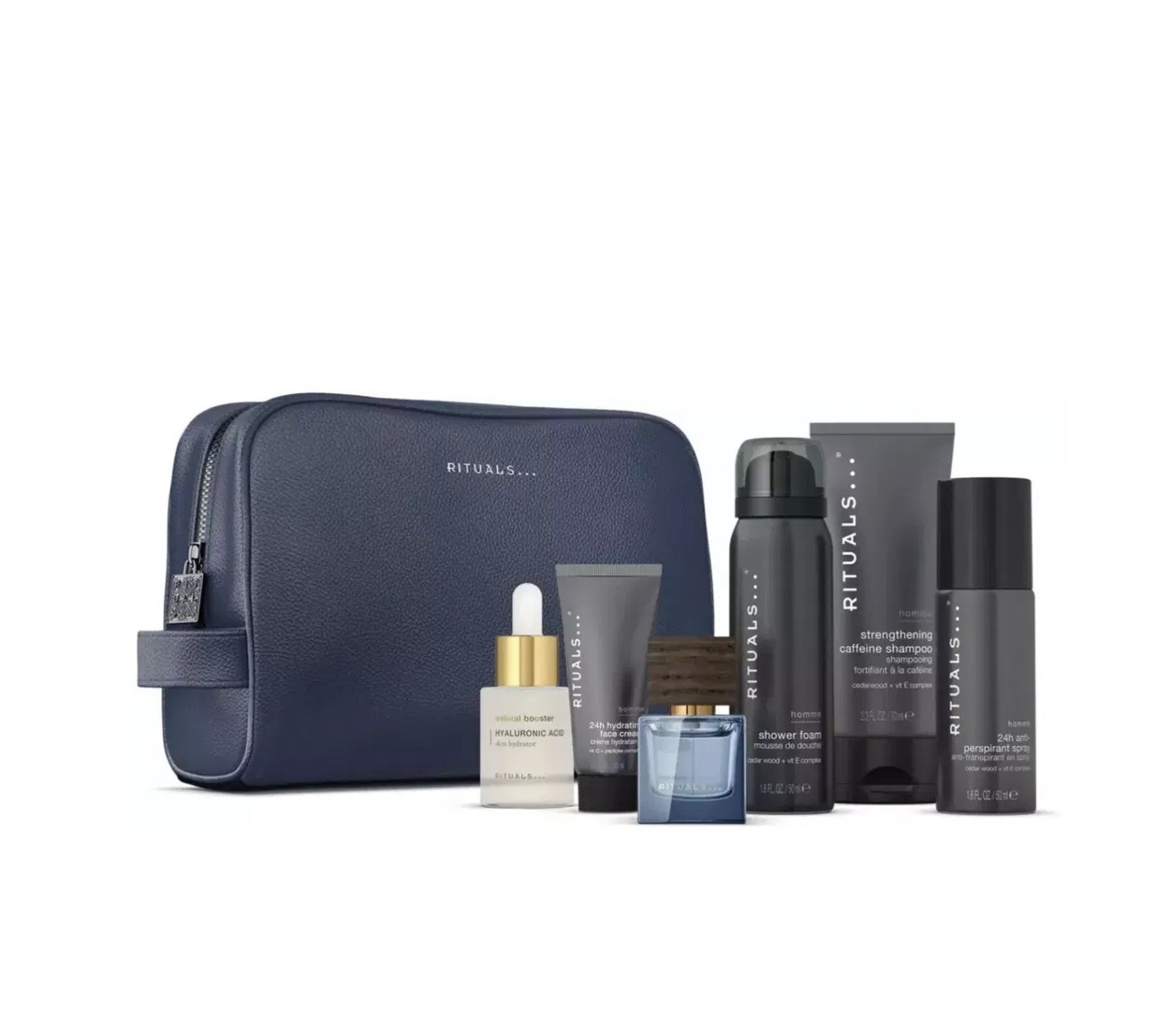 Набір Rituals The Ritual of Homme L (2025) містить засоби для щоденного догляду за тілом, обличчям і волоссям. Формати продуктів підходять для використання вдома та в поїздках. До комплекту входить косметичка для зберігання засобів.