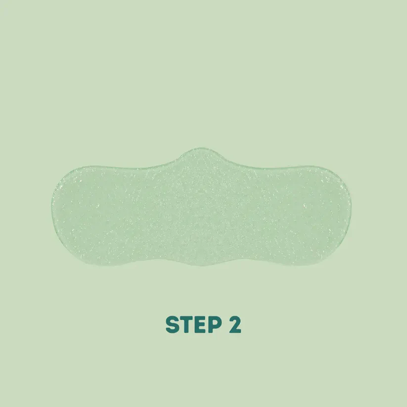 - Етап 1 — біоцелюлозна маска, просочена ліпосомами для очищення пор, допомагає пом’якшити та видалити чорні цятки та накопичення без різкого витягування.