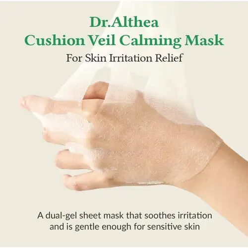 Dr. Althea Cushion Veil Calming Mask – це заспокійлива тканинна маска з охолоджуючим ефектом, просочена желеподібною есенцією з екстрактами центелли азіатської, ромашки та березовим соком.