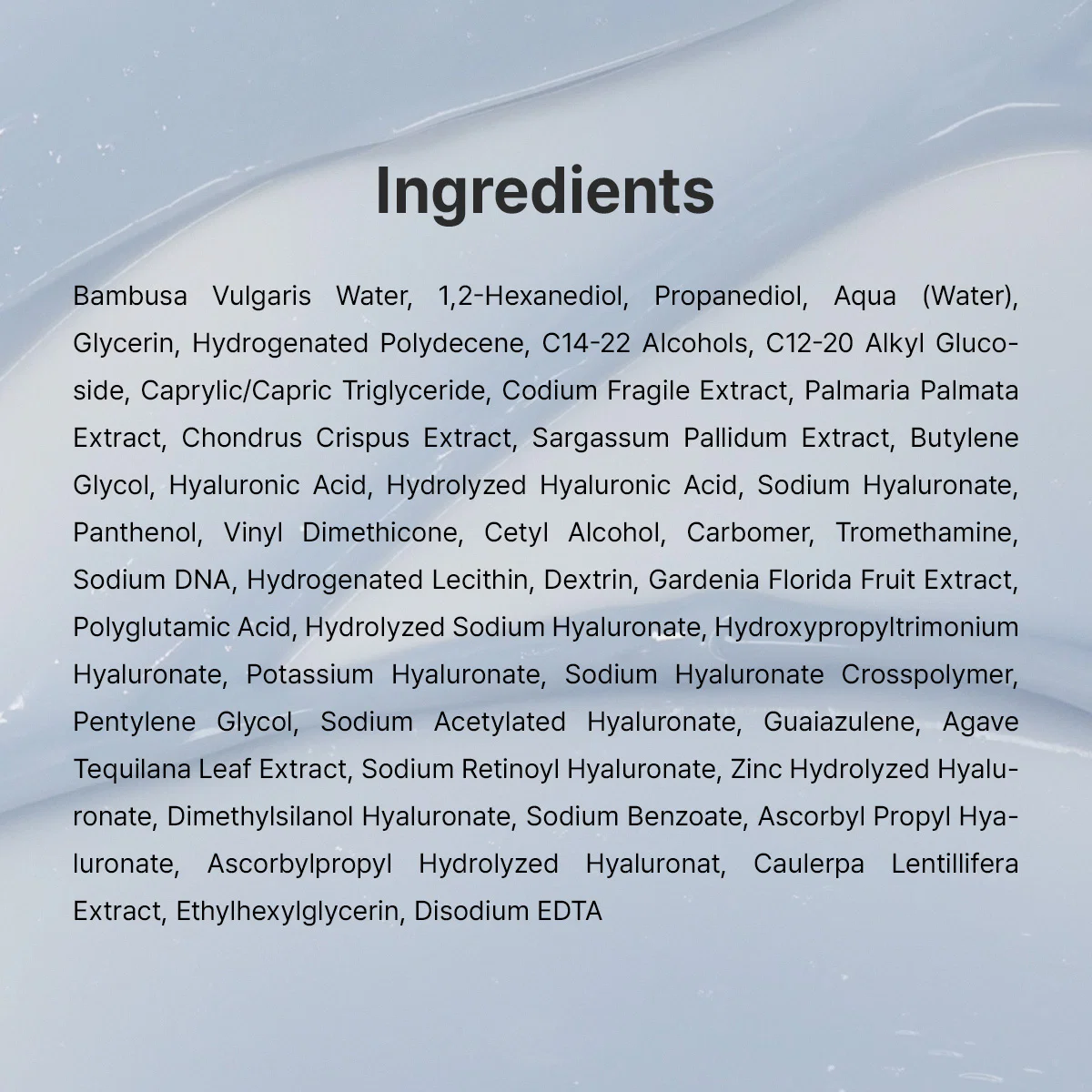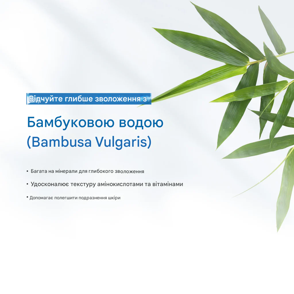 • Бамбукова вода – глибоко зволожує, пом’якшує та покращує еластичність шкіри.