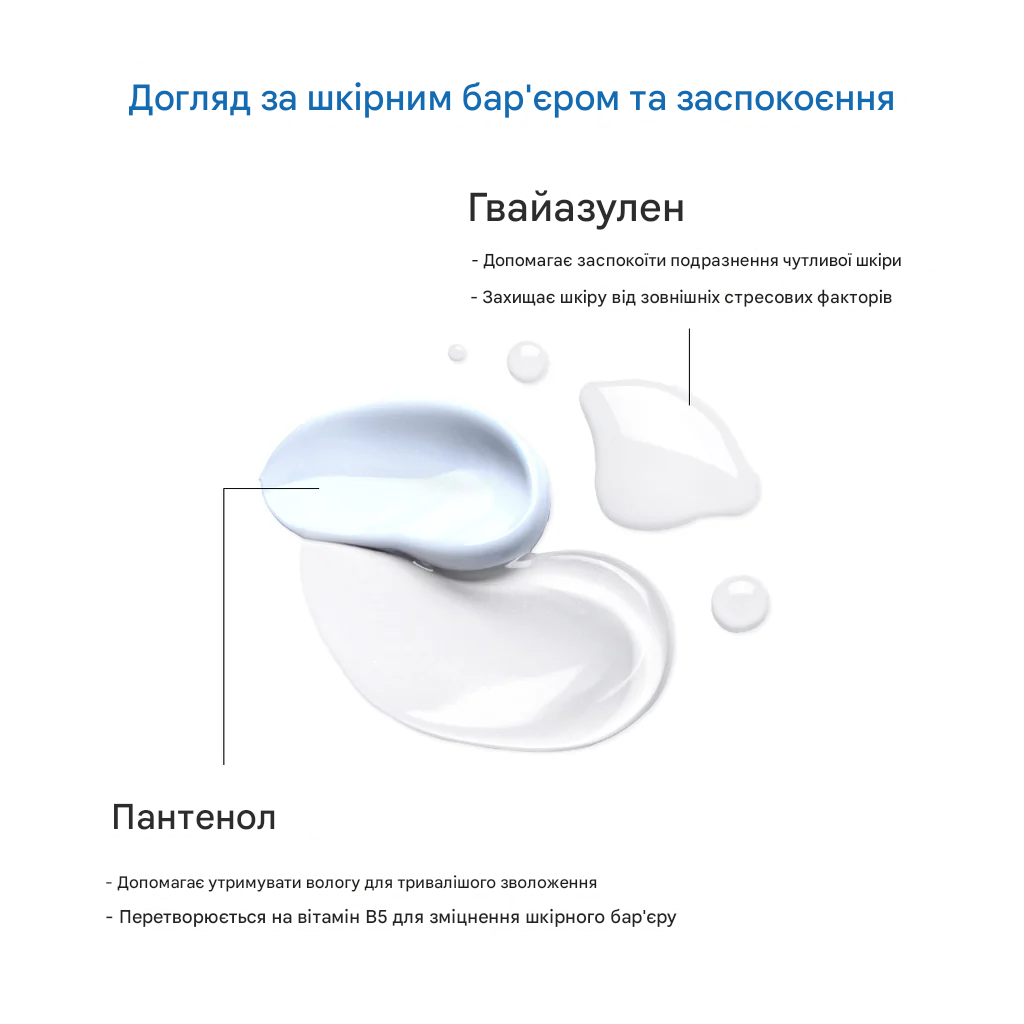 • Пантенол – зміцнює ліпідний бар’єр, зволожує, заспокоює та зменшує подразнення.