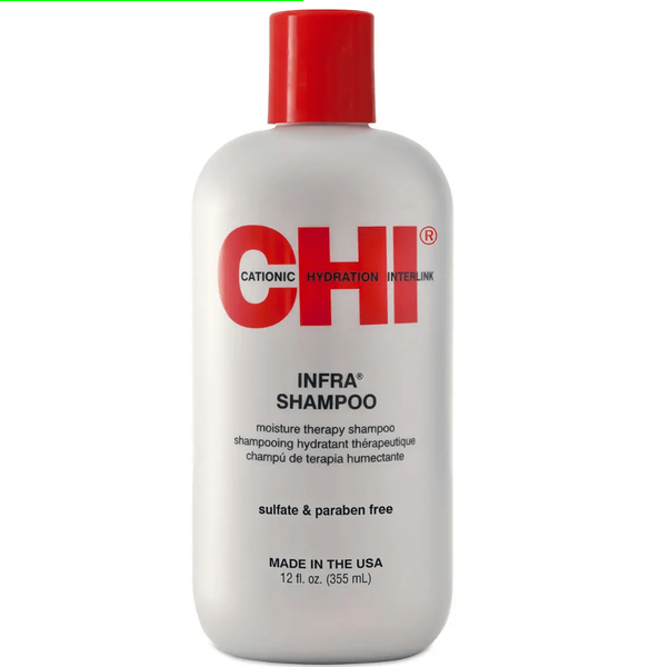 Очищувальний шампунь Infra Shampoo входить в революційну лінію Infra від американської лабораторії CHI, створену на основі ексклюзивної технології катіонного зволоження Cationic Hydrating Interlink, яка дозволяє гідролізованим протеїнам шовку швидше проникати в структуру волосся і чинити ефективну цілеспрямовану дію: інтенсивно відновлювати, зміцнювати і зволожувати нормальні або схильні до надмірної сухості локони, які часто піддаються згубній дії фарбувальних речовин і агресивних хімічних процедур.